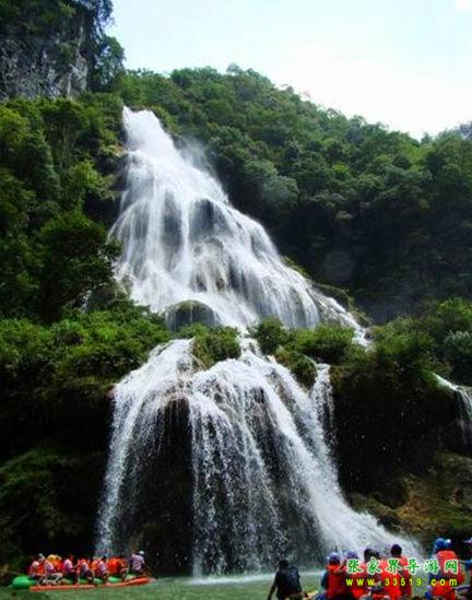 峽谷長100米,寬7米,高200多米。無數(shù)細(xì)流從絕壁上檐直垂河面,掛滿了峽谷,形成一條瀑布長廊。一縷縷、一絲絲、一串串宛若銀絲晶瑩透明。瀑布下面是一些奇形怪狀、滑得出奇的石頭露出水面,表面上青苔如茵,濕露露的、蓬松松的,像姑娘沒有織完的綠色地毯。谷中的漬石,塞在河心,酷似一頭牯牛,在河水的映襯下,輕緩移動(dòng),安然而富有生機(jī),游近瀑布,瀑聲如一群姑娘嬉笑逗鬧“咯咯”不停。遠(yuǎn)離瀑布,瀑聲又變得輕細(xì),似情人秘語沒完沒了,只不知牛郎織女躲到那里。如果說,落水坑瀑布?xì)鈩?shì)磅礴,不可阻擋,那么夢(mèng)思峽瀑布,情意綿綿,亦情亦景,若置身于夢(mèng)幻般的童畫世界,那無端的情思和無由的惦念一起涌來,使人飄然作相思?jí)簦悦麎?mèng)思峽。有人詩曰:夢(mèng)思峽水清悠悠,玉簾掛在天里頭,喬木昂首接青天,泛舟勝似畫中游。