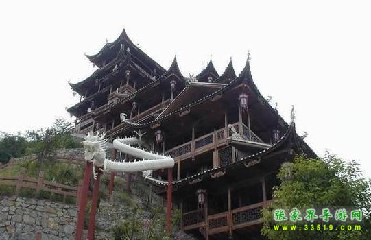 望郎峰北隔幽谷西望,一巨大石壁高聳云端,面寬達(dá)百米。因受風(fēng)雨剝蝕,流痕結(jié)網(wǎng),與頂端參差不齊的峰石結(jié)合,構(gòu)成錯(cuò)落有致的一幅壁畫:林木掩映的圍墻之內(nèi),池塘水榭,墻垣瓦梁,依稀可見。還有幾座吊腳樓,幾座寺廟,其間仿佛有人來往。雨天,云霧飄拂,樓臺墻垣若隱若現(xiàn),儼然海市蜃樓。