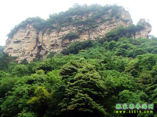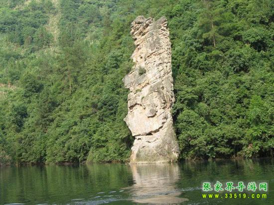 過了這道石門,眼前豁然開朗,只覺得湖光山色撲面而來。一只石孔雀正在我們面前展示它美麗的羽毛,半山腰那塊白色的石屏好像羽毛,前面一塊突出的小石峰好像它的頭,好一只美麗的孔雀!有人說:“孔雀開屏,脈脈含情。”也有人說:“孔雀開屏,自作多情。”你猜猜看,這美麗的孔雀是脈脈含情呢,還是自作多情?有人說張家界的山石草木都是情種呀。