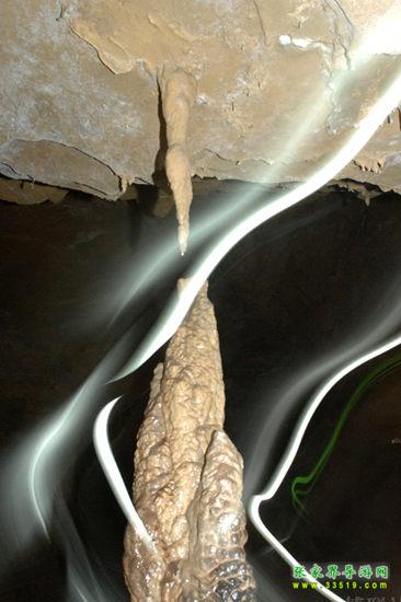 在這兒向您介紹一點(diǎn)溶洞學(xué)的知識(shí)。在溶洞中,自洞頂往下生長的叫石鐘乳,自洞底往上生長的叫石筍,兩者相向生長連在一起就叫石柱,三者統(tǒng)稱為鐘乳石。這兒有一根石鐘乳與一根石筍是相對(duì)生長的,差一點(diǎn)點(diǎn)就要連起來了,但他們卻永遠(yuǎn)不能合在一起,因?yàn)樯厦娴氖娙橐呀?jīng)沒有滴水,已經(jīng)失去了生命力。這好像一對(duì)苦苦守望的情人,近在咫尺,卻永遠(yuǎn)不能相逢。于是人們便給他們?nèi)×艘粋€(gè)非常動(dòng)人的名字——恨難逢。“盈盈一水間,脈脈不得語。”“天涯海角有窮時(shí),只有相思無盡處。”在無數(shù)個(gè)春去秋來的日子里,他們?cè)撚卸嗌匐x愁別緒??!——真不知道是石頭多情,還是人多情?——而有的人說得很樂觀,“兩情若是長久時(shí),又豈在朝朝暮暮”,所謂“距離產(chǎn)生美”嘛。