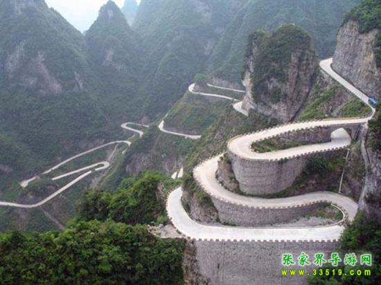 極具險絕奇觀的天門山盤山公路——“通天大道”則是天門山的另一壯景。通天大道態(tài)勢險絕,蕩氣回腸,更以蜿蜒迂回穿行于山體絕壁之天險而“堪稱天下第一公路奇觀”。它全長10.77公里 ,從標(biāo)志門直達(dá)天門洞腳下,海拔從200米急劇提升至1300米,共有九十九個彎,大道兩側(cè)絕壁千仞,空谷幽深,180度的急彎此消而彼長,層層疊起,中國書法協(xié)會常務(wù)副會長 沈鵬 先生走過通天大道后欣然為其題字“曲道通天”,字體遒勁挺拔,與通天大道的奇絕天下相融為一體。