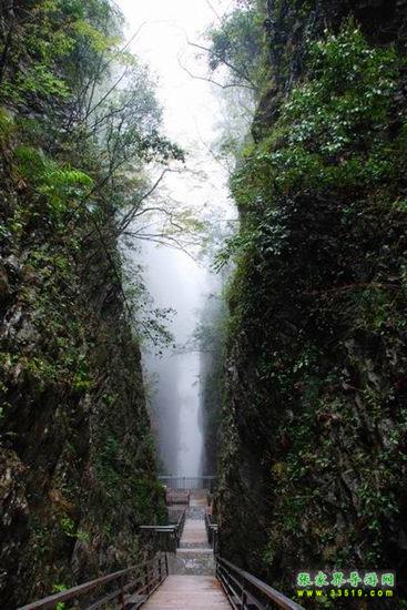 【一線天】來(lái)到這里,讓我們好好欣賞一下我們即將穿越的一線天峽谷絕壁吧。一線天峽谷,又叫西天門,宛若張家界大峽谷開啟的一扇大門,在歡迎大家的到來(lái)。不過(guò),這扇大門雖然很大很高,可是很窄小,這就給予了我們幾乎零距離體驗(yàn)峽谷絕壁的機(jī)會(huì)。三千翠微峰,八百琉璃水。這是對(duì)張家界奇山異水的贊譽(yù)??墒?,我們?cè)?a class="insidelink" href="http://www.daogoumao.com/" title="張家界">張家界其他景區(qū)游覽的時(shí)候,大多只是遠(yuǎn)觀或者是眺望張家界的奇山異水,一直沒有近距離體驗(yàn)和觸摸的機(jī)會(huì)。今天,我們就能夠近距離接觸我們張家界的神奇山水啦。這是我們來(lái)自××(客人所在地名)的各位的福氣呀。從我們所在的位置垂直向下,一直走到峽谷底部,步行的游道為700多米,垂直高差為300多米。