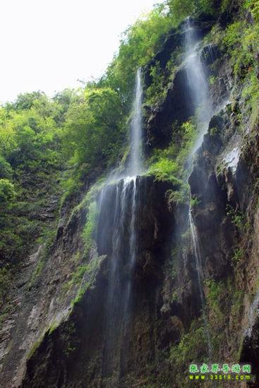 【珍珠墻】過(guò)了神泉橋,請(qǐng)大家留步,做一個(gè)短暫的停留。請(qǐng)大家看,我們的面前,石壁之上,生長(zhǎng)著很多植物,很多草類,山上的泉水沿著石壁,以均勻的流量漫流下來(lái),在這些草葉上、枝枝蔓蔓上形成了一個(gè)個(gè)潔白晶瑩的水珠,大家看像不像珍珠?游客朋友們都將這堵石壁叫做珍珠墻,掛滿珍珠的石墻啊。