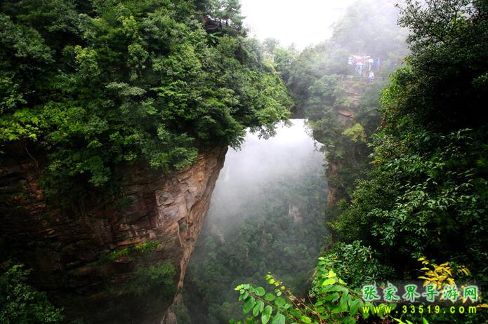 醉月臺(tái)西去兩百余米,有一座50多米長,15米厚的條石搭在兩座山峰之間,其下嵌空350多米,這就是名聲赫赫的天下第一橋。橋約20米長,最薄處約4米厚,最窄處只有2米多寬。與兩邊橋墩合為一體,天衣無縫。橋面兩側(cè)、橋頭兩壁上端均有綠樹簇?fù)?,郁郁蔥蔥,而橋下洞壁宛若刀削,草木不生。望橋臺(tái)有三處,其一在橋邊20米處,俯視橋面,但見兩側(cè)綠叢中間,一段平路通向彼峰,橋洞依稀,下端被密林遮住,往來其間,無甚驚險(xiǎn)。其二在橋左側(cè)30多米處的石壁上,透過樹枝向右下俯視,可見橋洞側(cè)面一部分,不知其下幽深幾許,若逢雨后初晴,有云霧在眼前突涌,亦不明其由來。最扣人心弦的是繞過右邊長達(dá)1200多米的“U”形深谷,隔200余米的澗谷向東觀賞,橋面橋洞,橋壁橋底,一覽無余。它造型巍峨,偉岸雄奇,高峻深險(xiǎn),形神逼真,確屬大自然神工鬼斧之杰作。