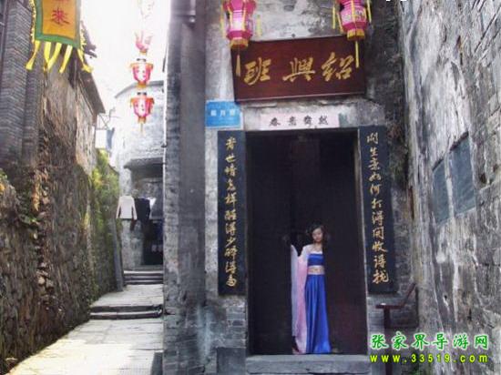 紹興班,位于余家沖,系清代青樓。 始建于清咸豐末年(1860年),是一座四周用封火墻圍護的木質穿斗式的結構建筑,單檐重層,兩進三層,各層樓道封閉,分隔有致。各房間置有暗門。具有極其隱蔽的行業(yè)特征。面闊較寬。有濕天井和干天井兩個。通風采光效果較佳。木窗均有雕花,且式樣各異。地面分別用青石板和杉木板鋪就,房間屋面均用洪油漆刷,整體形態(tài)完好。近作局部保護性維修;增添了相關實物布置和表演節(jié)目,對游客開放。