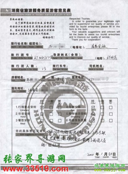 2010年1月27日河南牛先生一行13人旅游接待質(zhì)量反饋單