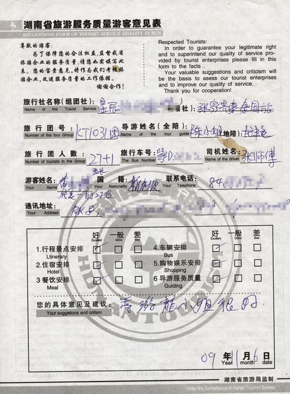 2009年10月31日新加坡黃先生一行27人旅游接待質(zhì)量反饋單: